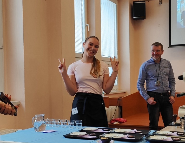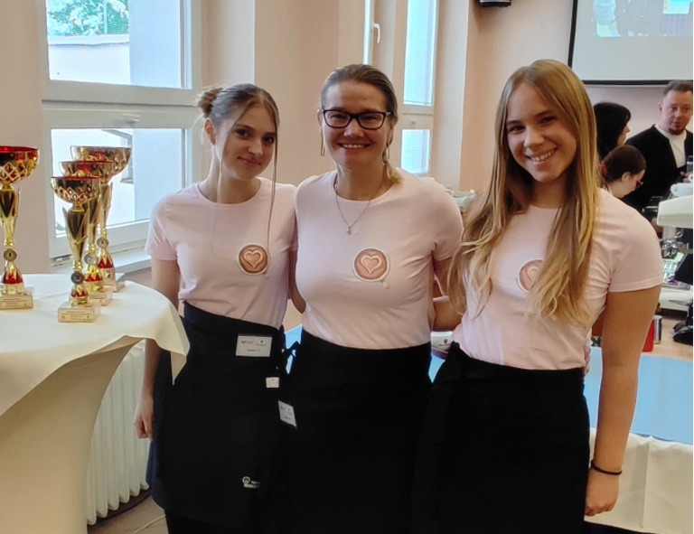 Za naši školu se zúčastnila zkušená baristka Hana Bürgerová ze 4. ročníku oboru Hotelnictví. Svým klidem, sebejistotou a skvělou prací ohromila porotu, všechny porazila a s přehledem získala vítězství. Tímto bychom chtěli Hance moc poděkovat za skvělou reprezentaci školy. Soutěže se zúčastnila také Natálie Rychetská ze 3. ročníku oboru Hotelnictví a obsadila velmi dobré místo ve druhé desítce. Tato soutěž byla však i výzvou pro paní učitelku Bc. Elišku Luňákovou, která děvčata do soutěže připravovala a také se do soutěže sama přihlásila. Její dovednosti hodnotila porota velmi vysoko, a tak se paní učitelka zaslouženě umístila na krásném bronzovém třetím místě, a stejně jako Hanka si přivezla ze soutěže velmi cenný pohár.