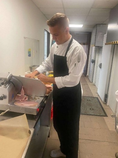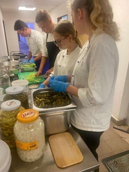 V pondělí a úterý jsme strávili celé dny v kuchyni, protože práce bylo hodně, ale času málo. Připravovali jsme výrobky studené kuchyně, což obnášelo krájení zeleniny a ovoce, obalování mini řízečku a skládání různých druhů uzenin a sýru na velké tácy. Naštěstí nám šla práce hezky od ruky a v příjemné atmosféře nás to moc bavilo.