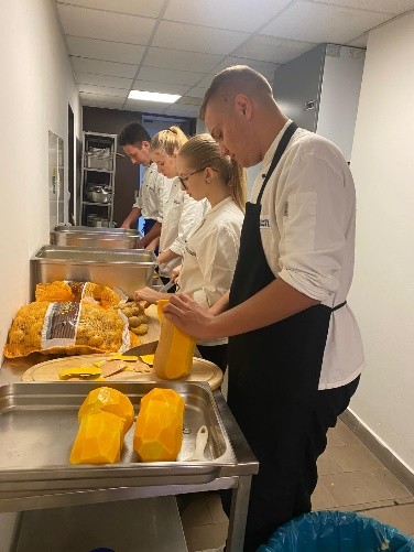 V pondělí a úterý jsme strávili celé dny v kuchyni, protože práce bylo hodně, ale času málo. Připravovali jsme výrobky studené kuchyně, což obnášelo krájení zeleniny a ovoce, obalování mini řízečku a skládání různých druhů uzenin a sýru na velké tácy. Naštěstí nám šla práce hezky od ruky a v příjemné atmosféře nás to moc bavilo.