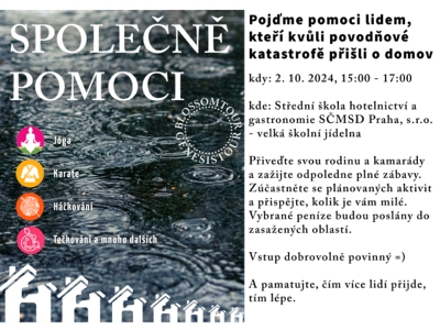 Ve středu 2. října 2024 se na Střední hotelové škole v Klánovicích uskutečnil charitativní workshop Společně pomoci. Cílem akce bylo vybrat peníze na pomoc rodině zasažené záplavami. Na jeho realizaci se podíleli žáci 3. ročníku obor Cestovní ruch, dále Dominika, Karolína a Nelli ze 4. ročníku, Daniel z 1. ročníku a učitelé Blanka, Tereza a Ondřej.